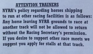 Not content to sit on their laurels and let New York horses ship to tracks like Laurel, NYRA revealed their plan to keep their horses racing locally. But they’re not similarly raising their purses? Ha! No, that would cost money, and NYRA is subscribing to the policy of not spending money when you can get the same result for free, which is why it is only a matter of time until they also require that any trainer stabling horses in New York must give their DRF login information, so every NYRA board member can access DRF+ without paying! Their free solution, via DRF’s David Grening, is to ban horses from hooking up with other tracks for one-afternoon stands: