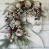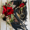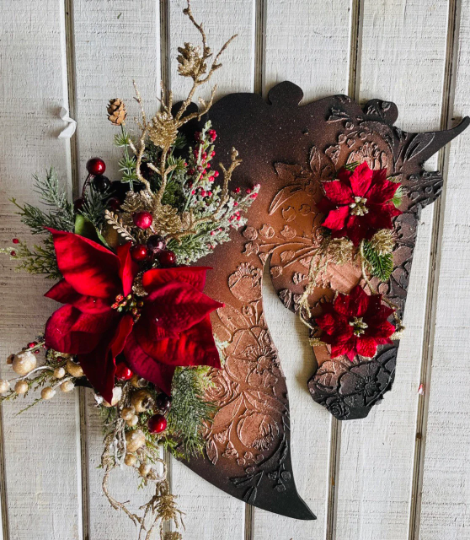 A beautiful way to invite your friends and family into your Equestrian Christmas home! Artistic wooden horse head door hanger adorned with beautiful artificial flowers. The flowers are painted with glitter paint and the horse has an embossed feel with an artistic pattern raised above the wood. Simple bridle.