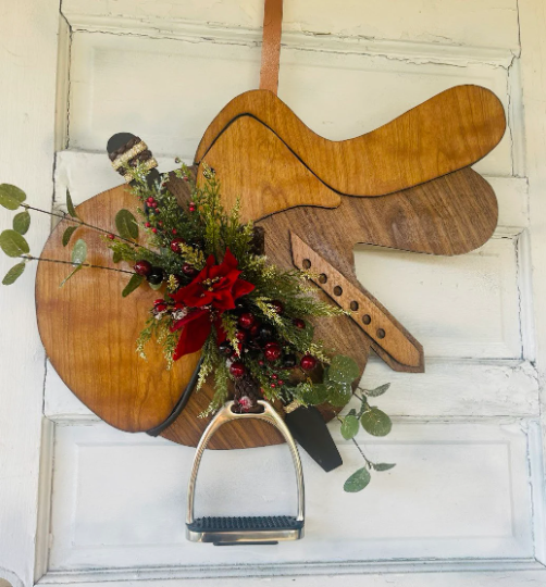 Christmas Wood Hunter Jumper Saddle Wreath- Wood Door Hanger w/ poinsettia Floral Riding Crop- Wood Dressage Saddle – Dressage Trainer Gift