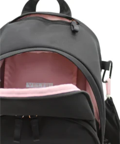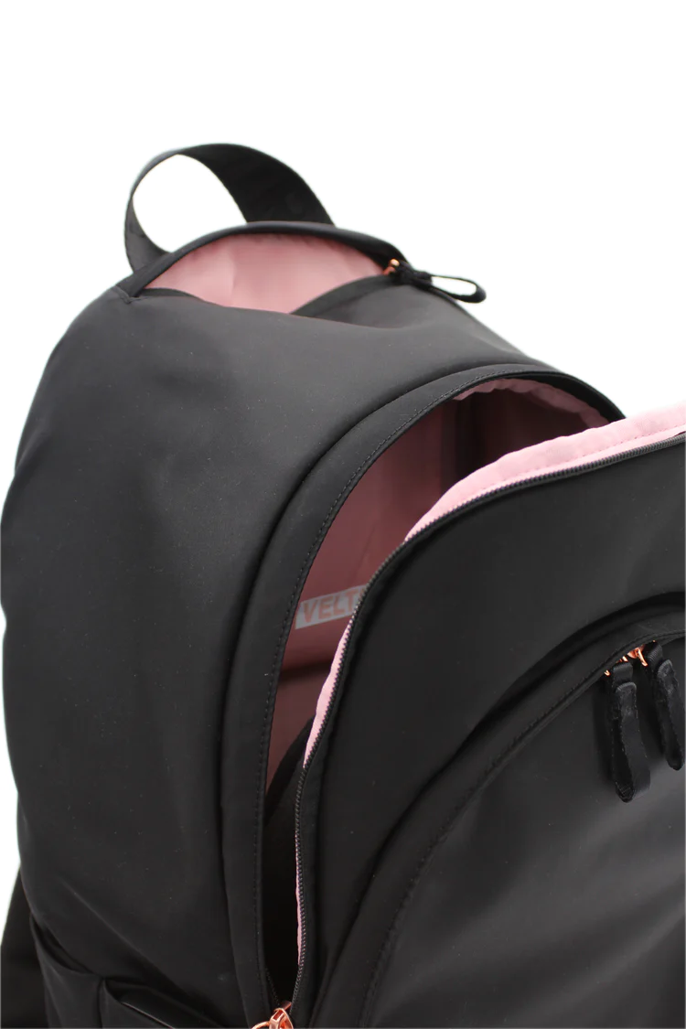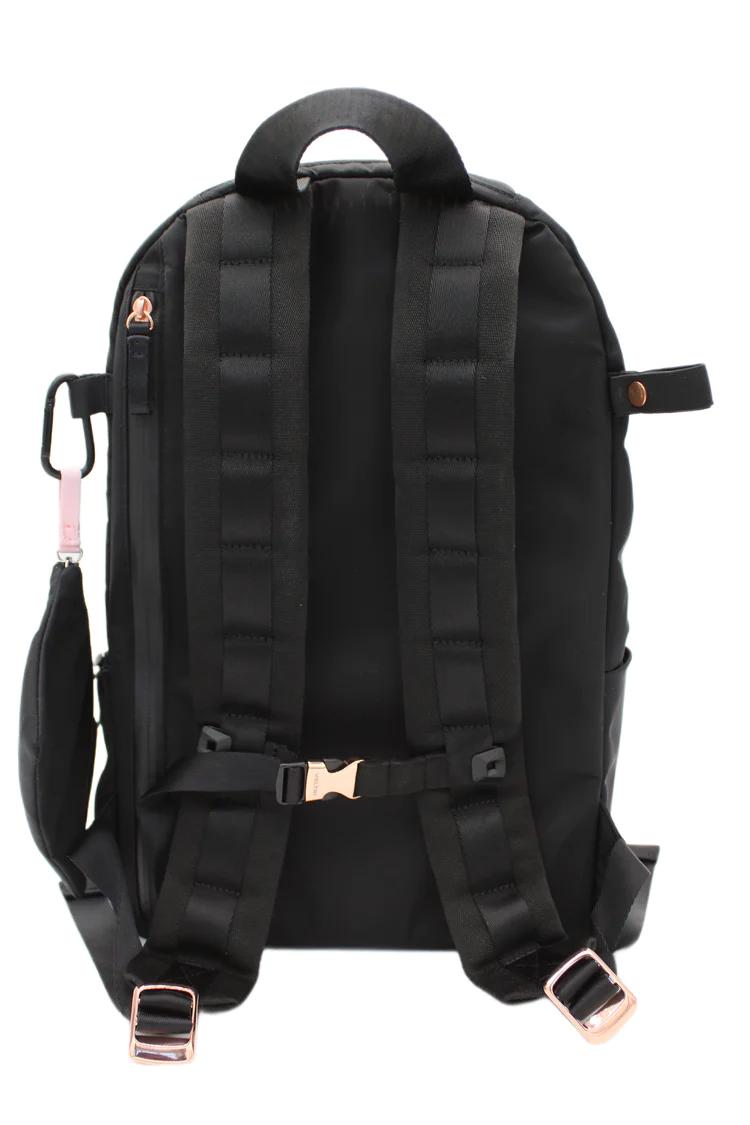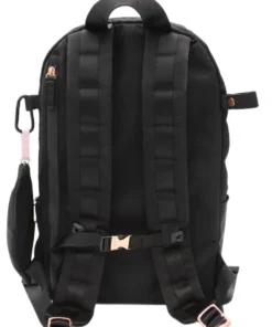 The Delaire Equestrian Backpack in rose gold is perfect for equestrians on the go. Featuring a padded helmet compartment, padded laptop compartment with waterproof zipper, small zip pouch, secure top zip pocket, open exterior cell phone and bottle pocket, carabiner clip that can hold pouches and miscellaneous items, a front belt harness, and rose gold colored hardware. This equestrian backpack is water resistant and extra comfortable with adjustable and cushioned straps for extended wear. It’s also eco-friendly, made out of 100% recycled nylon (exterior) and polyester (interior).