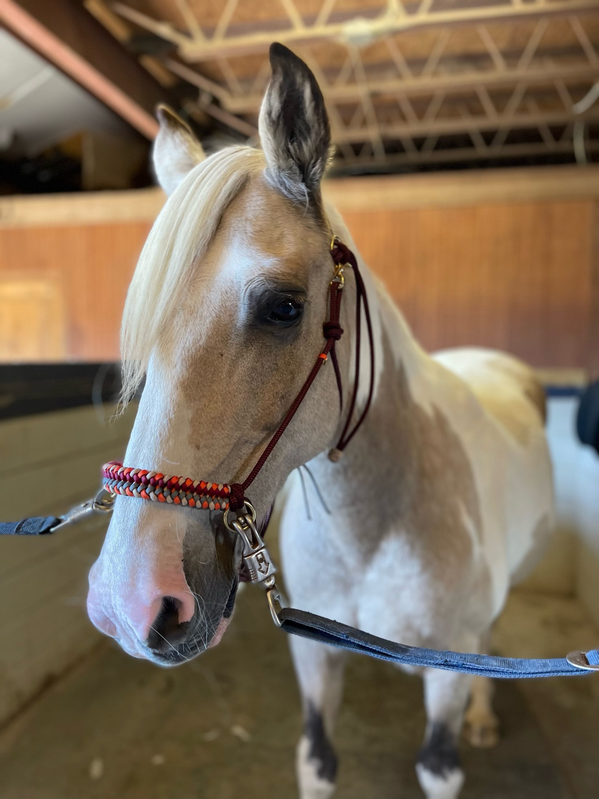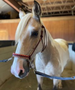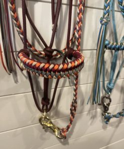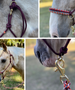 This is a soft rope halter with a paracord noseband overlay. The main rope used is a high-quality very durable 1/4 inch polyester yacht braid. The overlay is added using paracord. The style of this halter is perfect for everyday use and bitless riding. A sliding ring below the chin allows you to easily attach the included matching braided lead rope. The rings on the noseband are perfect for using in a crosstie or for snapping on reins and hitting the trails! The halter itself also clips on so you do not have to tie and untie it each time. Because of the small diameter of the main rope, it also fits nicely under most bridles. This halter is made in mini, pony, arab/cob, horse, warmblood, and draft sizes. There is a size chart in the images for your reference. If you are concerned about a perfect fit, please select “custom size” and I would be happy to make a halter according to your measurements. You may choose one color for the main rope and up to four for the knotted noseband overlay. The lead rope is braided paracord and a great length at 10 feet long with a snap. It’s lightweight and incredibly durable. Perfect for everyday use and training. Lead rope can be made in four colors.