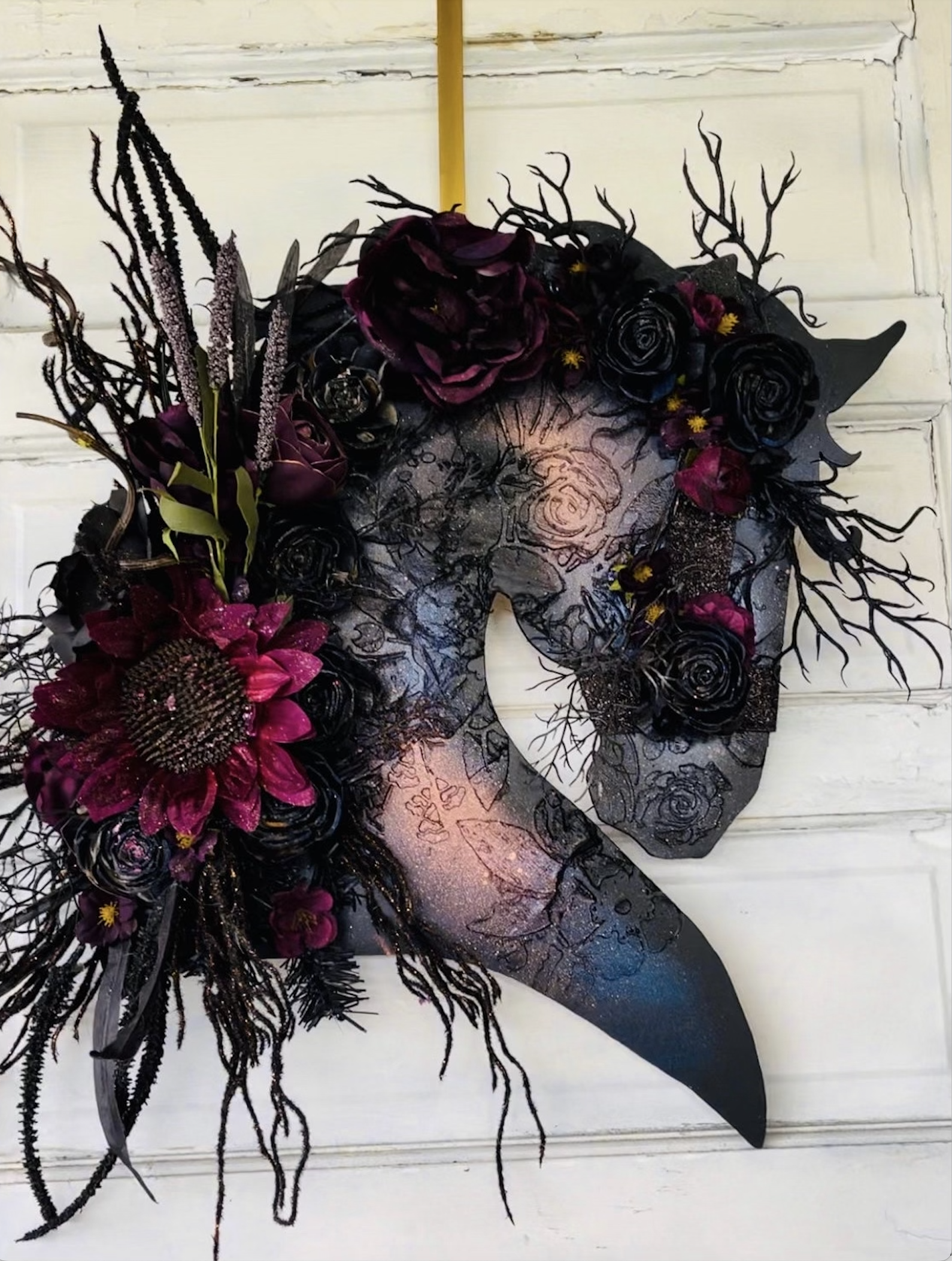 A beautiful way to invite friends and family into your home! This Artistic wooden Halloween Horse Wreath hangs on your door with beautiful artificial flowers. The flowers are painted with glitter paint and the horse has its own glitter ribbon bridle. Perfect for fall and spooky for Halloween, it’s sure to delight horse lovers!