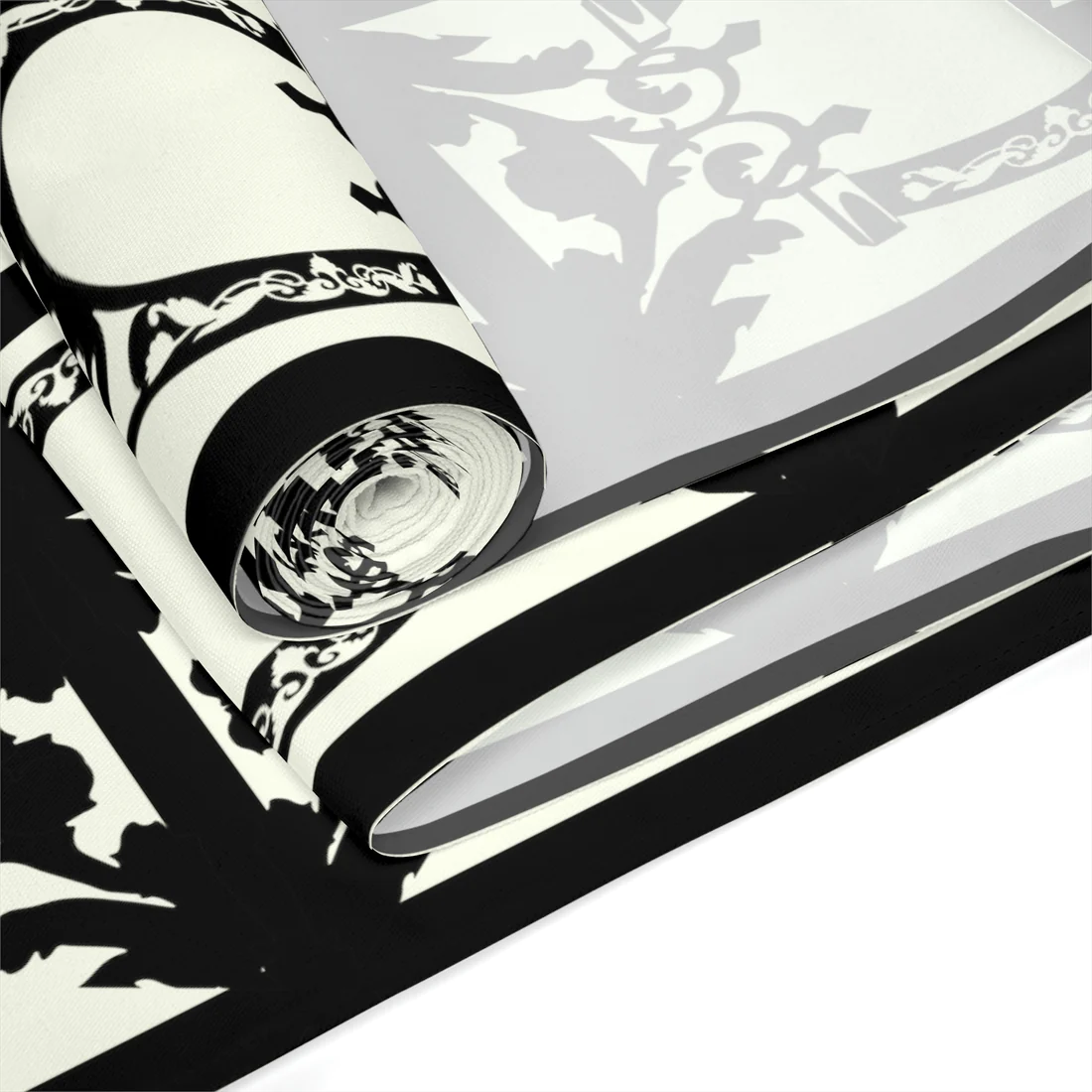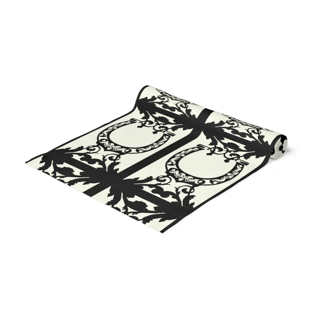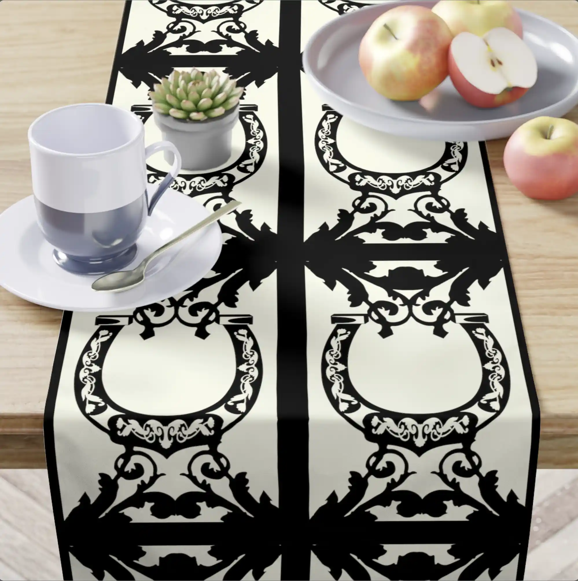 Add a touch of equestrian style to your home with a little horseshoe décor. Measuring at 90” x 16”, this equestrian table runner with horseshoe motif is the perfect way to add a splash of personality in any home setting. Made with lightweight broadcloth that is hemmed on all sides, this table runner is both soft to the touch and water-resistant. Printed with dye sublimation for incredibly vivid, custom designs on the top side.