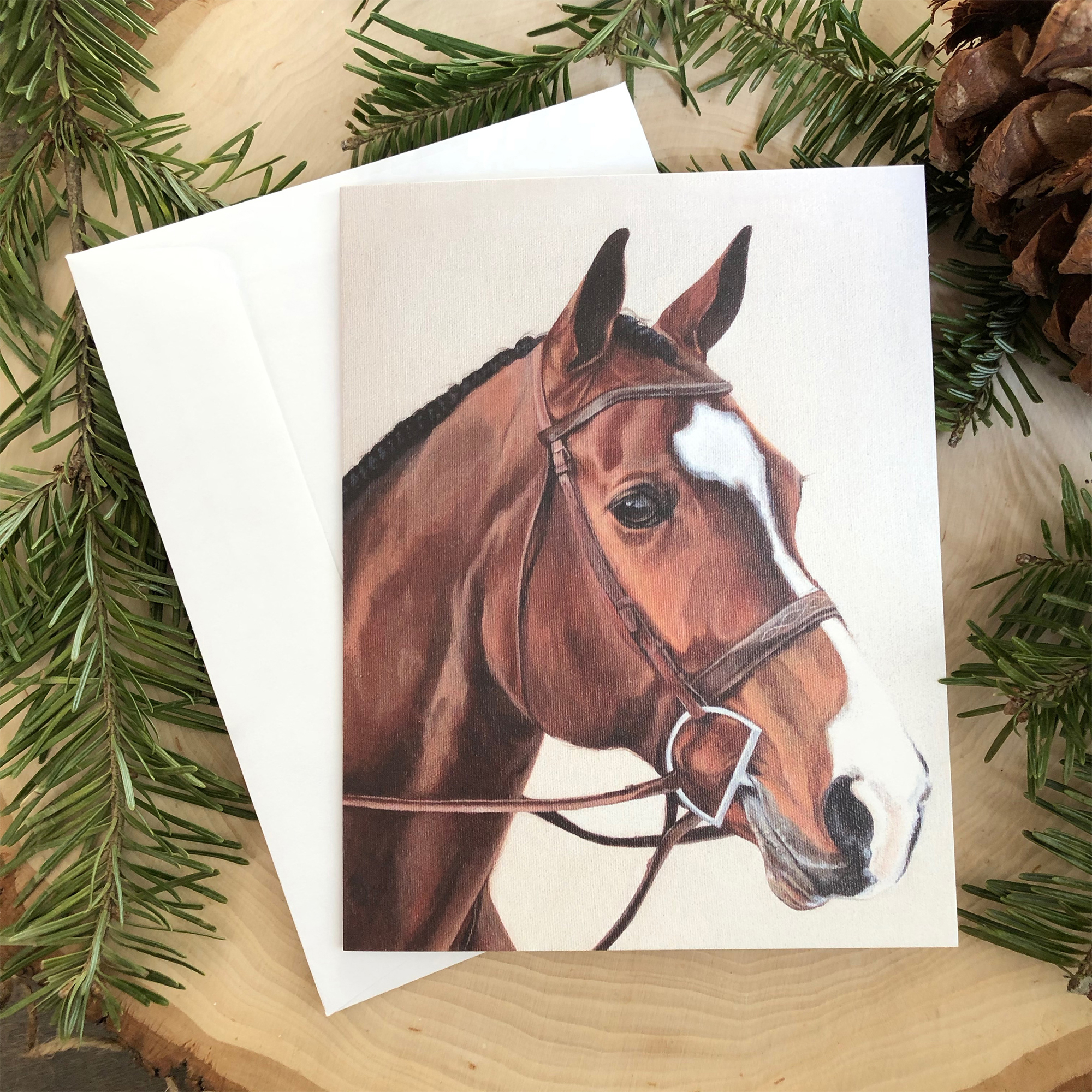 Blank inside, these bay horse greeting cards are perfect for any occasion. Printed on quality card stock, each card includes a fitted, white envelope and comes packaged in a clear card jacket for protection. Makes a classy finishing touch to gift giving. Can also be framed and gifted as a small artwork to equestrians and horse lovers. Sold individually.