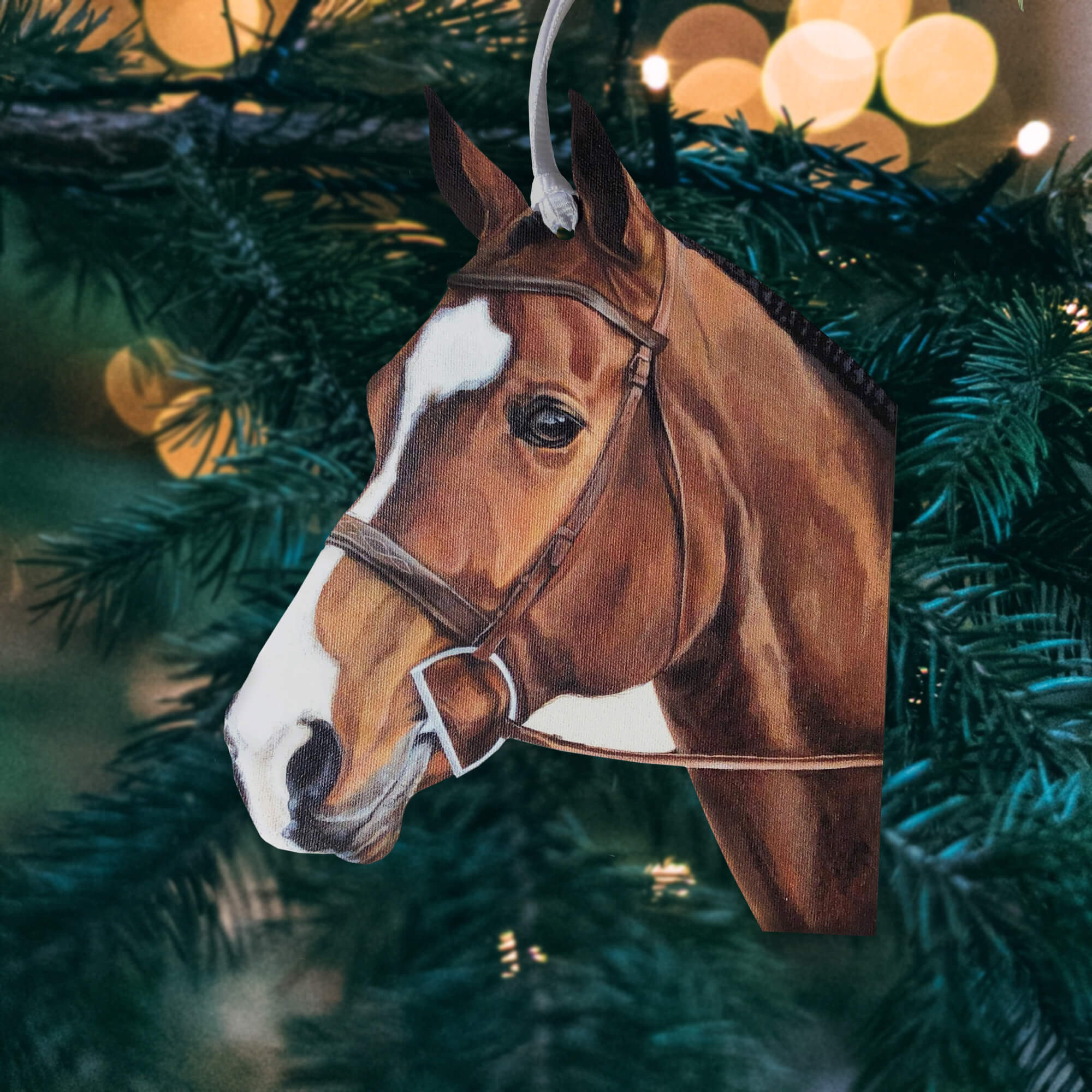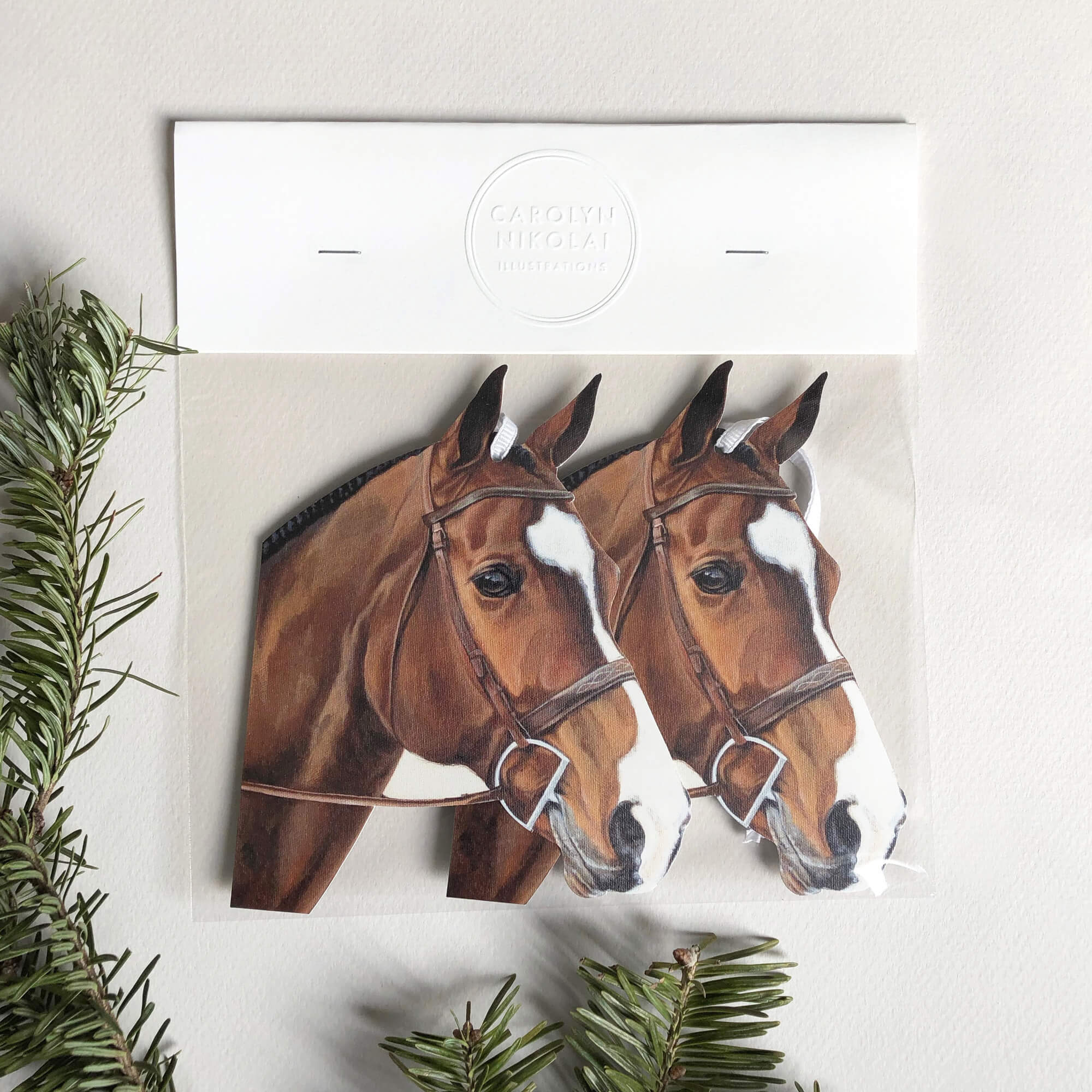 Bring your love of horses to your Christmas tree with a set of bay horse ornaments. Child and pet friendly, these lightweight paper ornaments are perfect to hang from your tree or garland. Or use them as gift tags to embellish your gift wrap.