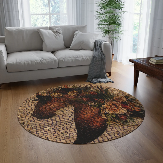 Decorative rugs with fun, bright designs have made a huge comeback. Create a stunning design with graphics or funky characters, and print them on this round 100% polyester chenille rug in picture-perfect quality. It features a coated backing and hemmed edges for durability.