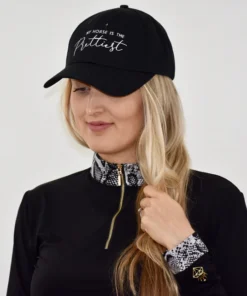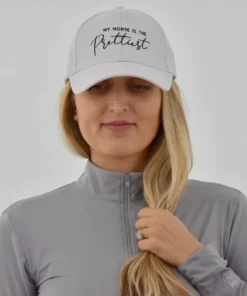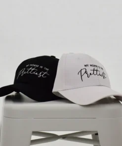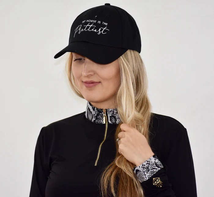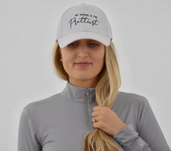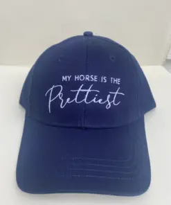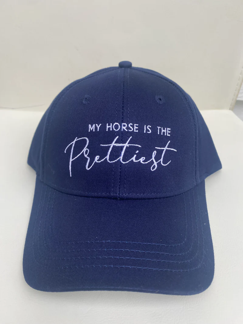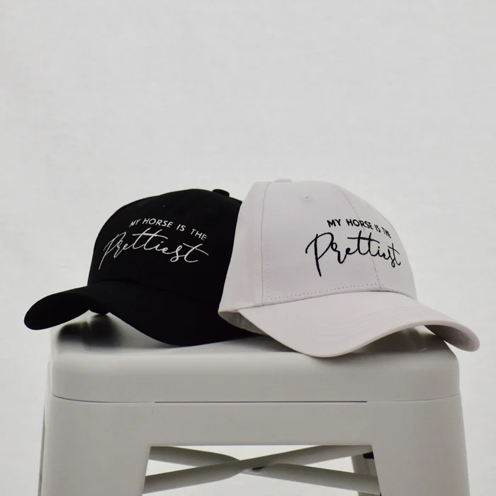 Our signature ‘My Horse is the Prettiest‘ horse hat is a 6-panel, unstructured baseball cap, embroidered in white or black stitching.