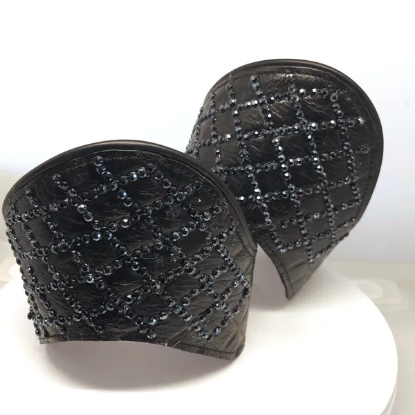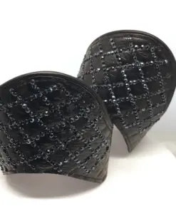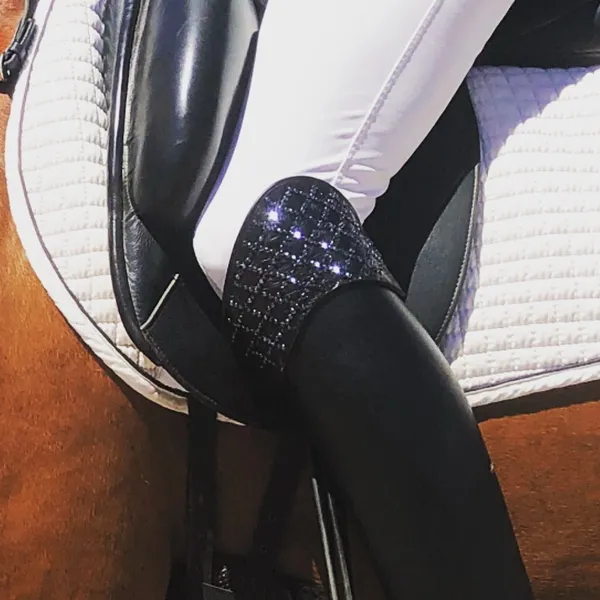 These elegant black riding boot crowns will make you stand out. Each crown is embellished with genuine Swarovski crystals “all over” the side to create a luxurious, eye-catching effect. Lined with our signature purple sueded to prevent twisting and a clip to keep them flush with your riding boots so they stay firmly in place no matter your equestrian discipline. Secured with strong Velcro ends.