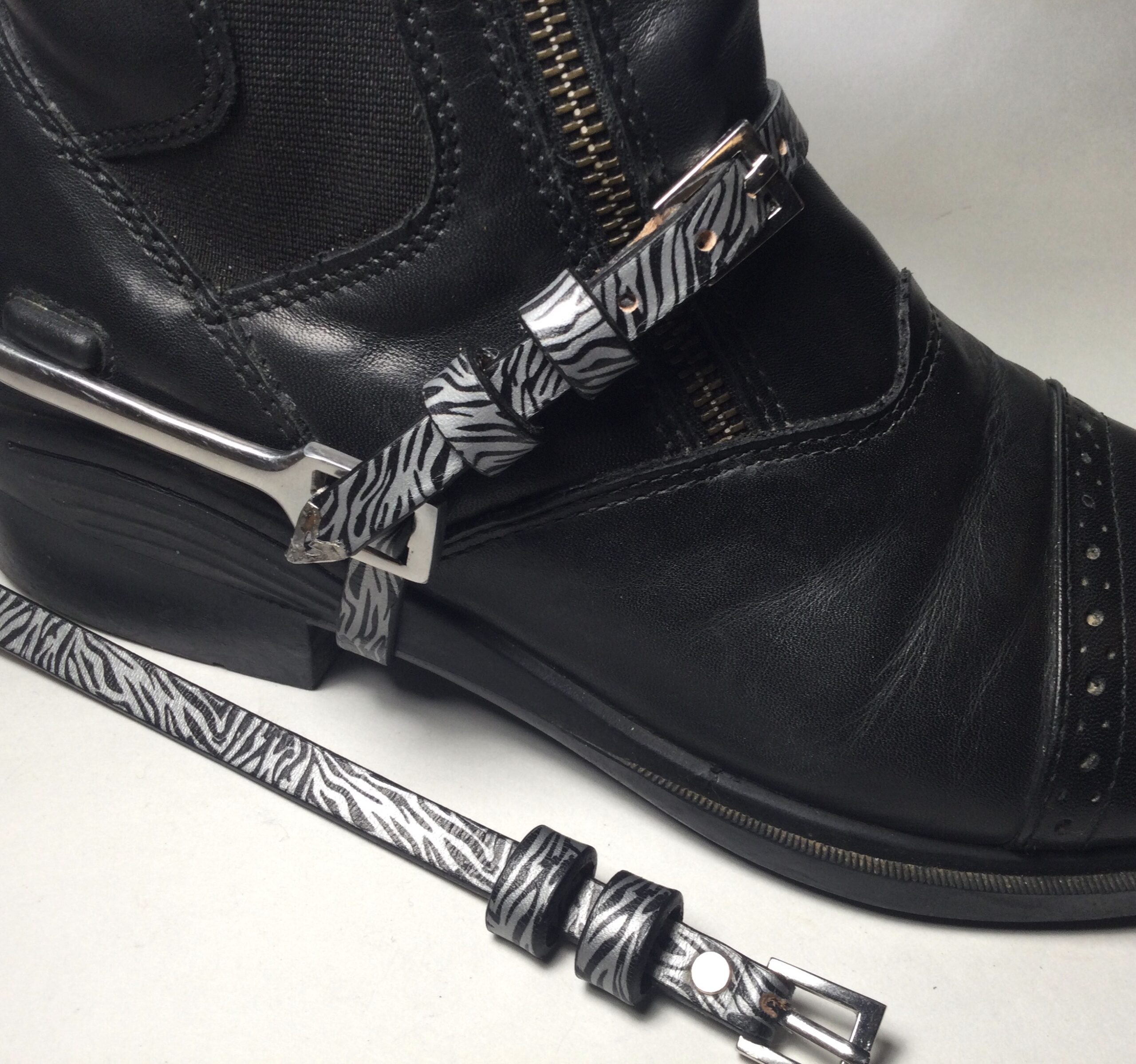 Handmade with 100% cowhide, metal rivets and leather epoxy for strength, these zebra print spur straps are a cool, fun alternative to standard black straps. Double keepers. Check out the rest of my spur strap collection! I hope you enjoy wearing them as much as I love making them!