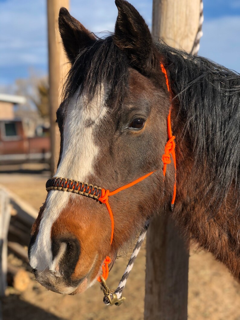 This is a stiff rope halter with a paracord noseband overlay. The main rope used is a high-quality very durable 1/4 inch polyester yacht braid. The overlay is added using paracord. The style of this halter is perfect for training and bitless riding. Because of the small diameter of the main rope, it also fits nicely under most bridles. This halter is made in mini, pony, arab/cob, horse, warmblood, and draft sizes. There is a size chart in the images for your reference. If you are concerned about a perfect fit, please select “custom size” and I would be happy to make a halter according to your measurements. You may choose one color for the main rope and up to four for the knotted noseband overlay. The lead rope is nit included in this listing. Perfect for everyday use and training. This item is made to order in your choice of colors and size!
