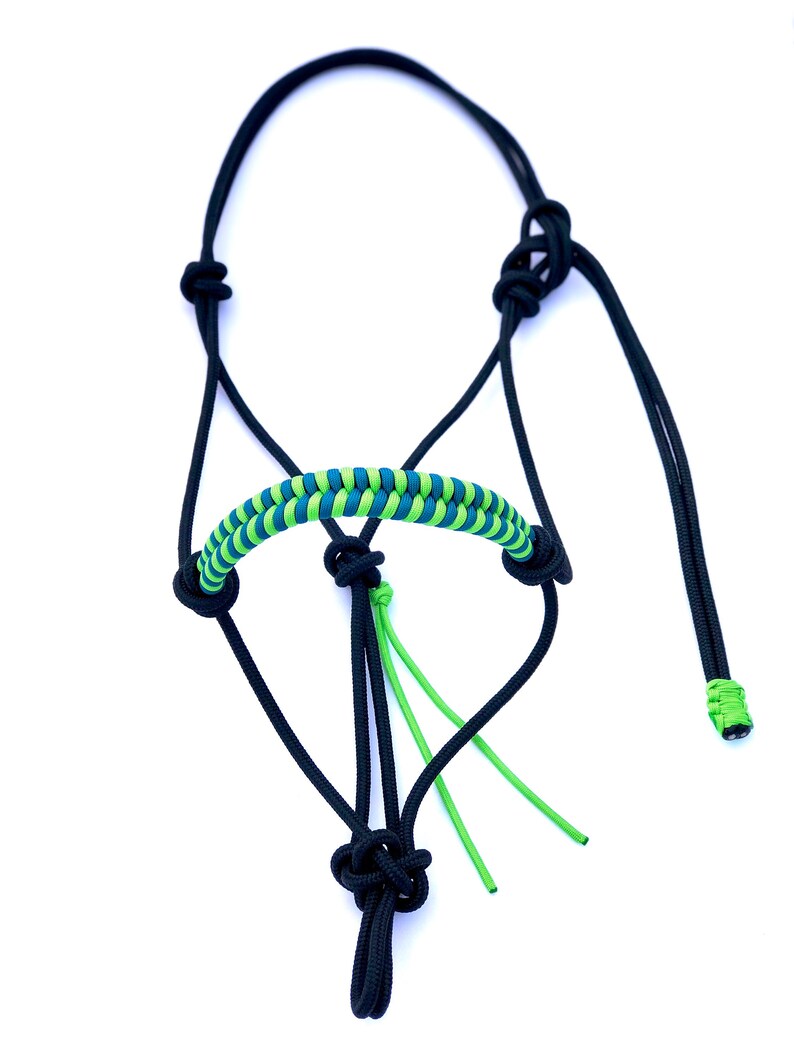 This is a stiff rope halter with a paracord noseband overlay. The main rope used is a high-quality very durable 1/4 inch polyester yacht braid. The overlay is added using paracord. The style of this halter is perfect for training and bitless riding. Because of the small diameter of the main rope, it also fits nicely under most bridles. This halter is made in mini, pony, arab/cob, horse, warmblood, and draft sizes. There is a size chart in the images for your reference. If you are concerned about a perfect fit, please select “custom size” and I would be happy to make a halter according to your measurements. You may choose one color for the main rope and up to four for the knotted noseband overlay. The lead rope is not included in this listing. Perfect for everyday use and training.
