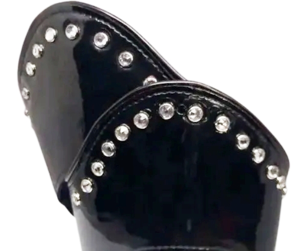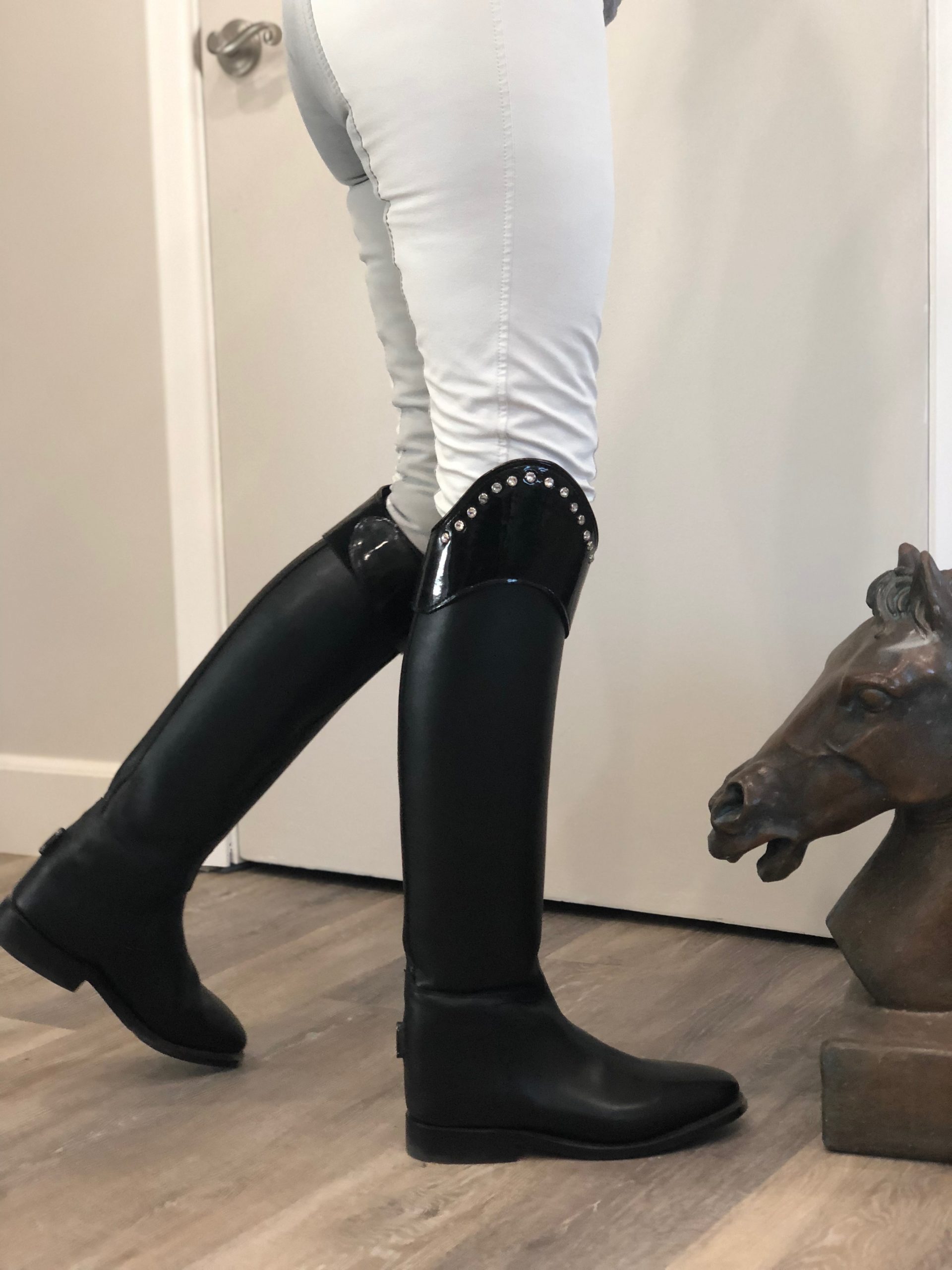 The Royal Palm is made from a pliable patent leather with large silver Swavroski crystal rhinestones that add some serious bling to your tall riding boots. These boottoppers are easy on/off allowing for quick and easy customization of your existing boots. Also available with Gold, Blue, Pink rhinestones. Silver will be sent if no other option is chosen.