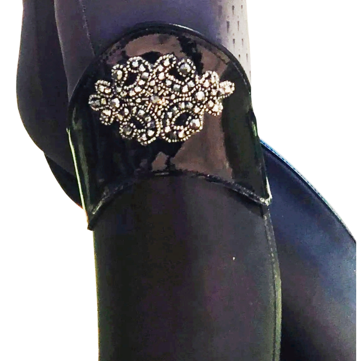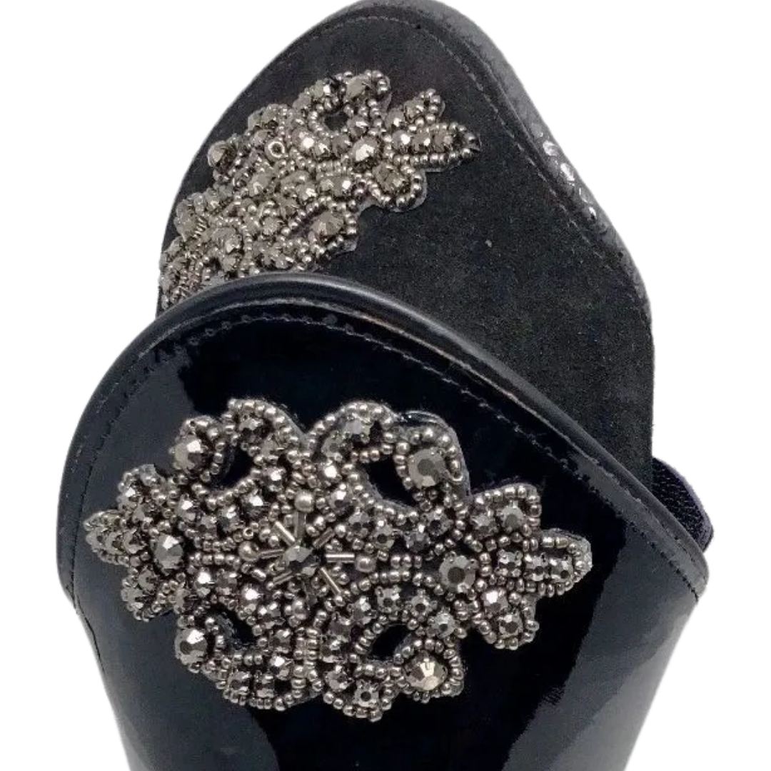 The Versailles is made from a pliable leather with a Swavroski crystal rhinestone medallion that adds some serious bling to your tall riding boots. Available in a shiny black patent or deep brushed suede that looks like black velvet. Choose your option below. These boottoppers are easy on/off allowing for quick and easy customization of your existing boots.