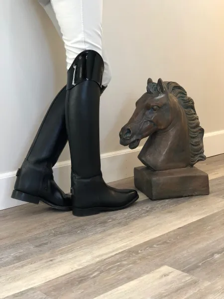 The Wellington is made from a pliable patent leather that adds subtle bit of bling to your tall riding boots. These boottoppers are easy on/off allowing for quick and easy customization of your existing boots.